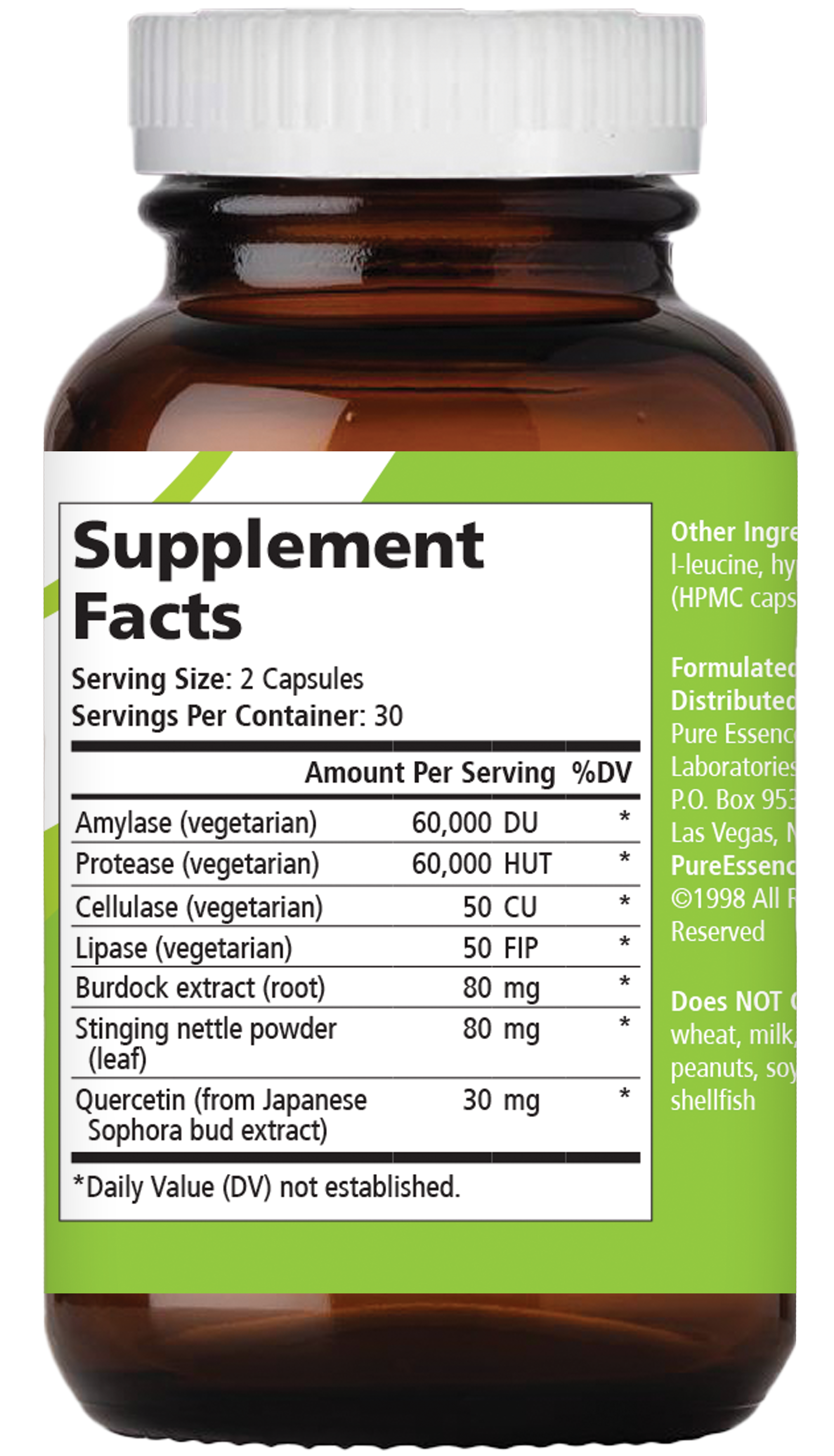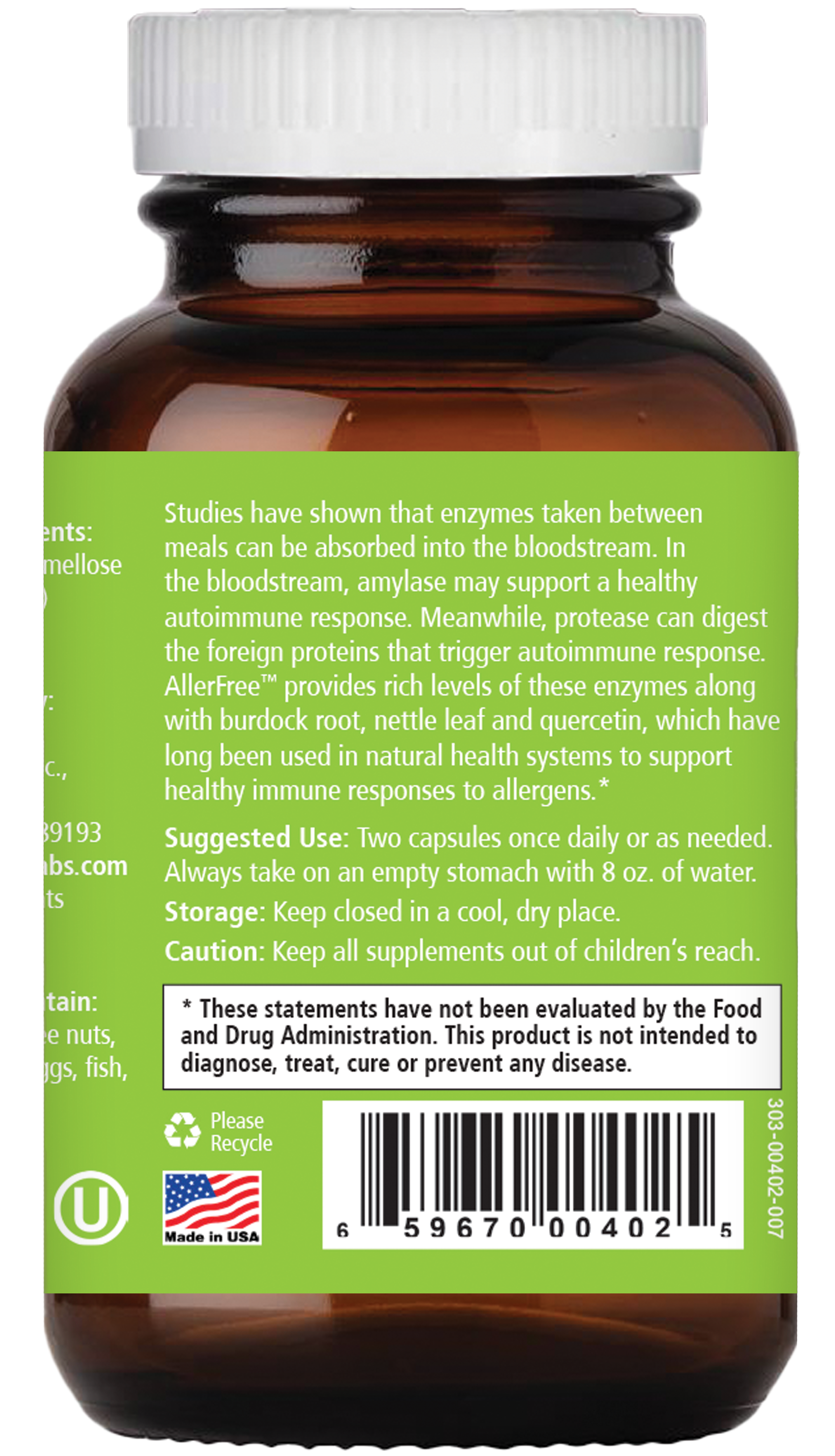 Studies have shown that enzymes taken between meals can be absorbed into the bloodstream. In the bloodstream, amylase may support a healthy autoimmune response. Meanwhile, protease can digest the foreign proteins that trigger the autoimmune response. AllerFree provides rich levels of these enzymes along with burdock root, nettle leaf, and quercetin, which have long been used in natural health systems for centuries.