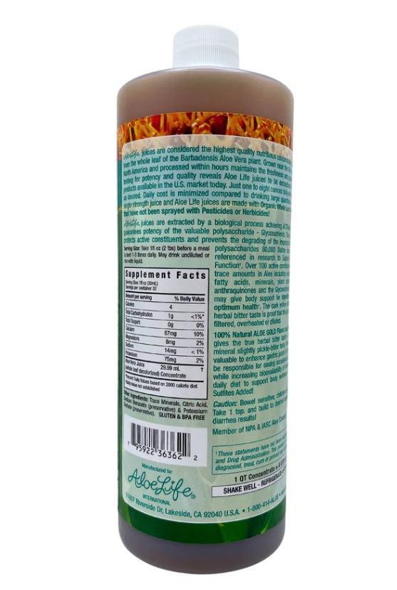 Aloe Gold is a unique, certified organic, whole leaf aloe formulation with trace minerals and the highest level of Aloe polysaccharides (third party certified by ActivAloe), nutrients that support the immune system. The strong flavor indicates Aloe Gold's potency, and it supports over 30 individual body functions, including benefits for all the digestive organs, regularity, pH balance, skin, circulation, energy, and immunity. It is safe for extended use by seniors, children, pregnant or nursing women. In a comparison with other Aloe Vera products tested by a reputable third-party laboratory, no other aloe came close in polysaccharide activity. This product has no added water or juice.