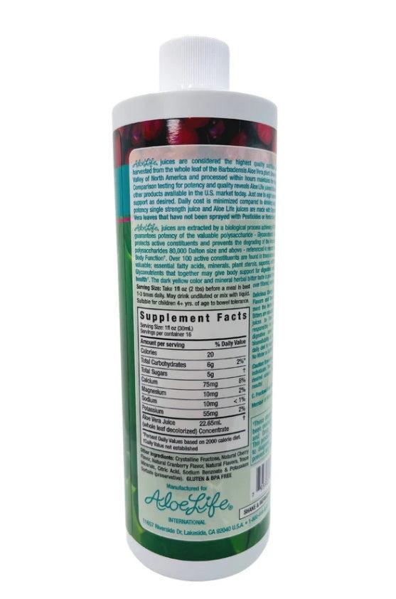 Cherry Berry has Aloe Gold as a base juice with cherry and cranberry fruit juice added. Cherry Berry is a unique, certified organic, whole leaf aloe formulation with trace minerals and the highest level of Aloe polysaccharides (third party certified by ActivAloe), nutrients that support the immune system. It is safe for extended use by seniors, children, pregnant or nursing women. Cherry Berry Aloe supports over 30 individual body functions, including benefits for all the digestive organs, regularity, pH balance, skin, circulation, energy, and immunity. In a comparison with other Aloe Vera products tested by a reputable third-party laboratory, no other aloe came close in polysaccharide activity. This product has no added water.