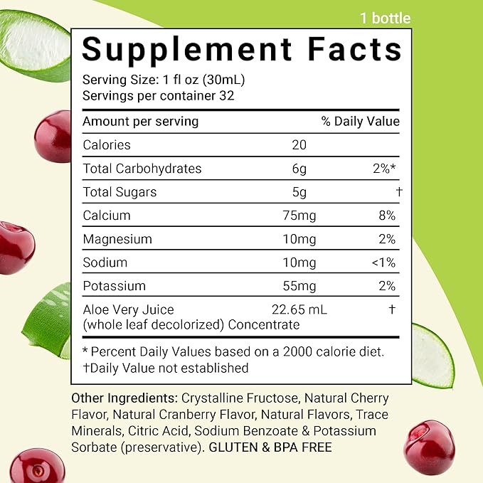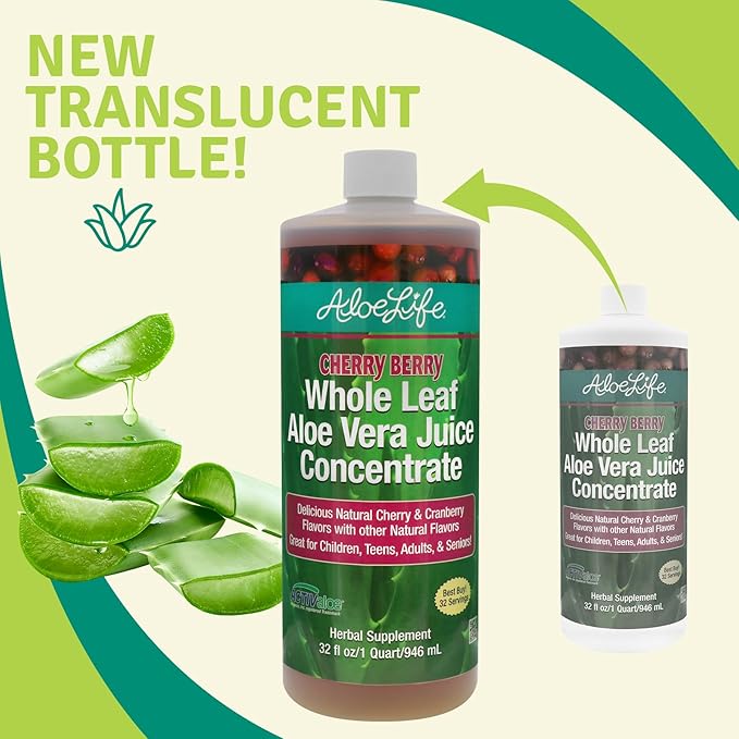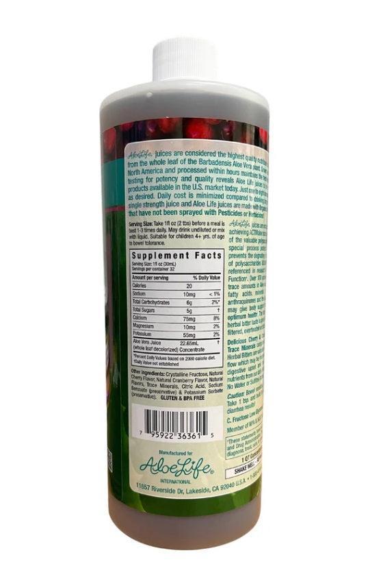 Cherry Berry has Aloe Gold as a base juice with cherry and cranberry fruit juice added. Cherry Berry is a unique, certified organic, whole leaf aloe formulation with trace minerals and the highest level of Aloe polysaccharides (third party certified by ActivAloe), nutrients that support the immune system. It is safe for extended use by seniors, children, pregnant or nursing women. Cherry Berry Aloe supports over 30 individual body functions, including benefits for all the digestive organs, regularity, pH balance, skin, circulation, energy, and immunity. In a comparison with other Aloe Vera products tested by a reputable third-party laboratory, no other aloe came close in polysaccharide activity. This product has no added water.