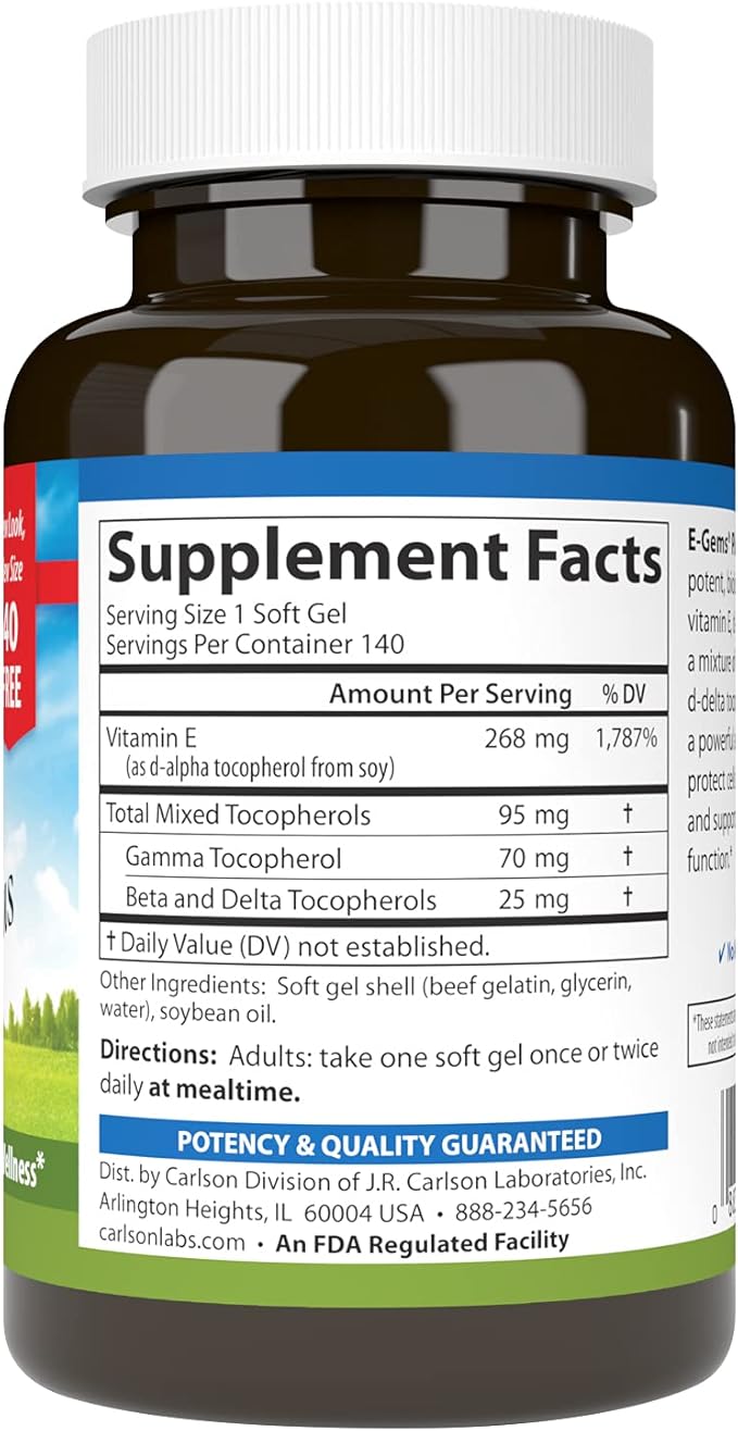 Since 1965, Carlson has provided one of the most complete lines of high-quality, natural-source vitamin E, starting with their first formula: Key-E®. Vitamin E plays an important role in cardiovascular health and is recognized as one of the best antioxidants. E-Gems® provides 400 IU (268 mg) of vitamin E per soft gel.