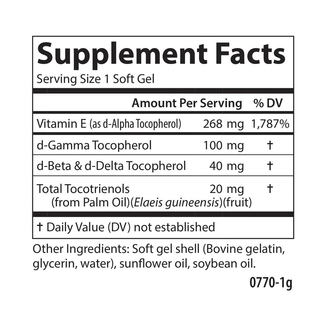 E-Gems® Elite 268 mg (400 IU) is an exclusive blend of the entire vitamin E family, including eight forms of tocopherols and tocotrienols. Vitamin E offers many health benefits and plays an important role in cardiovascular health and protecting the body from free radical damage.