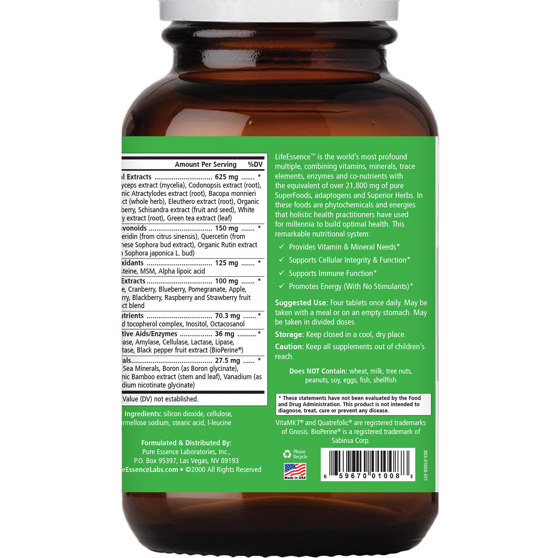 LifeEssence is the world’s most profound multiple, combining vitamins, minerals, trace elements, enzymes, and co-nutrients with the equivalent of over 44,000 mg of pure Superfoods, adaptogens, and Superior Tonic Herbs. These foods contain phytochemicals and energies that holistic health practitioners have used for millennia to build optimal health. This remarkable nutritional system provides Vitamin & Mineral Needs, Supports Cellular Integrity & Function, Supports Immune Function, and Supports Immune Function.