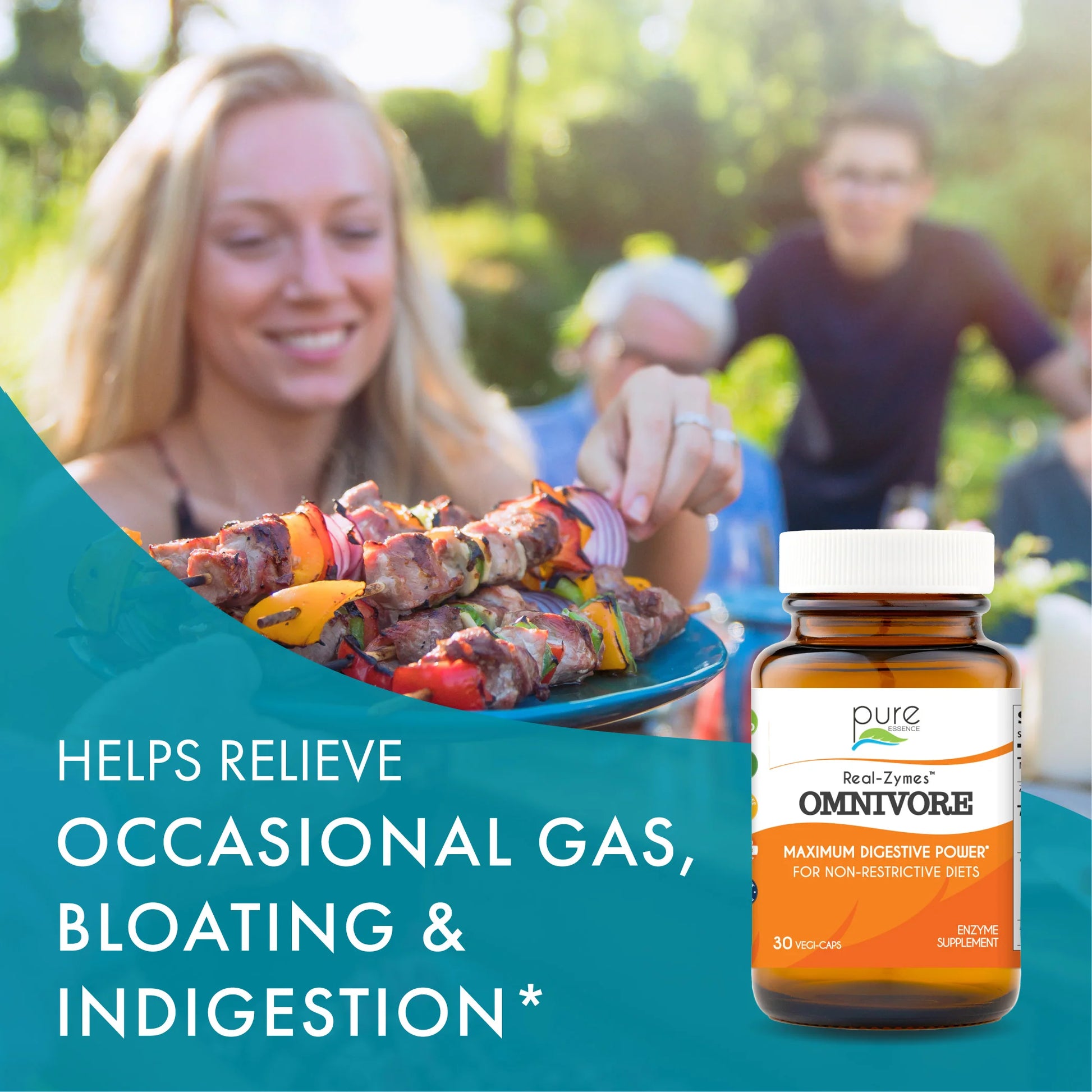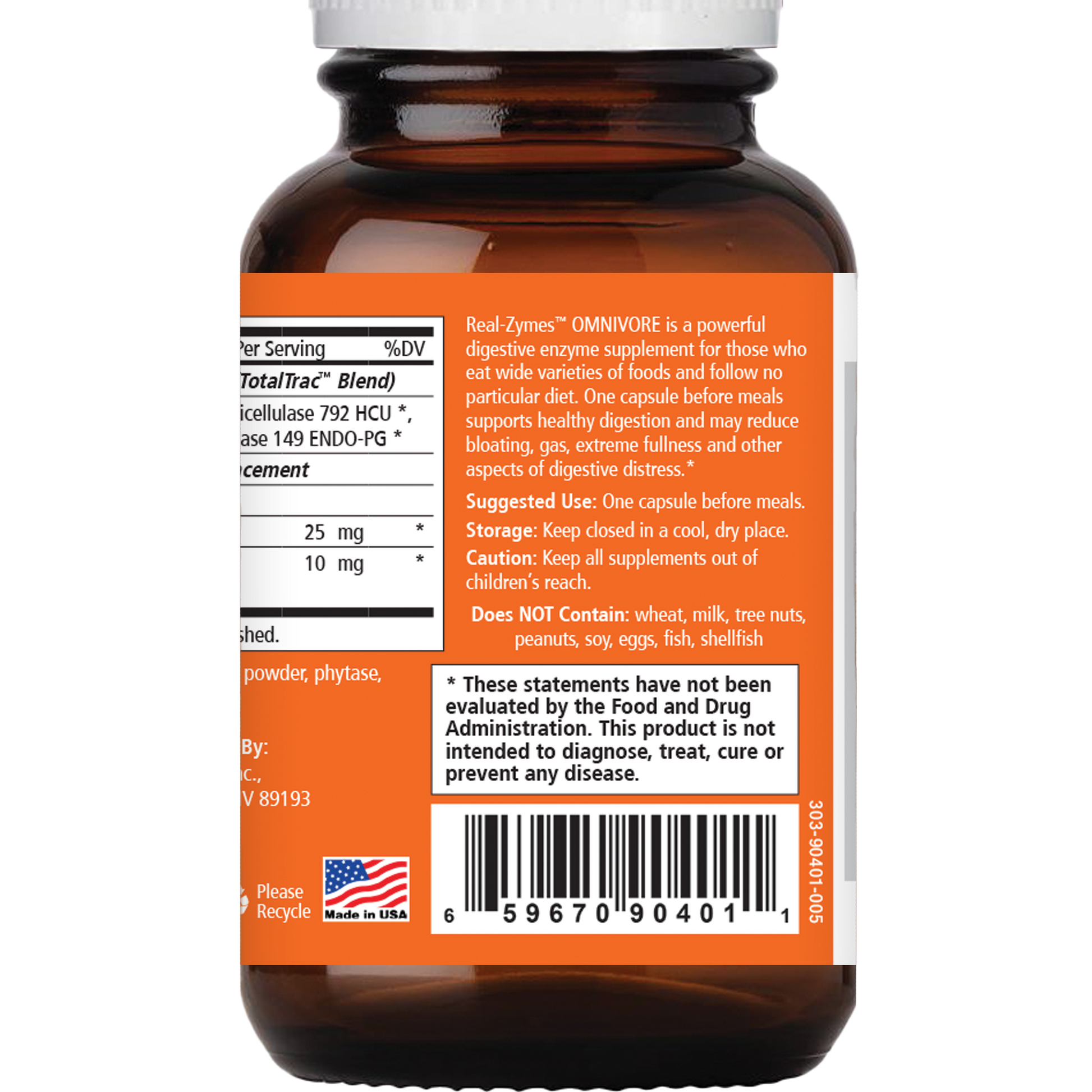 Because omnivore diets contain more carbohydrates than other plans, they require more carbohydrate-digesting enzymes. Real-Zymes OMNIVORE is the world’s first enzyme supplement built to digest omnivore meals. It delivers: 13 different carbohydrate and fiber-digesting enzymes, 9 other enzymes for proteins and fat, quicker, more complete digestion, better nutrient absorption, and reduced digestive distress.