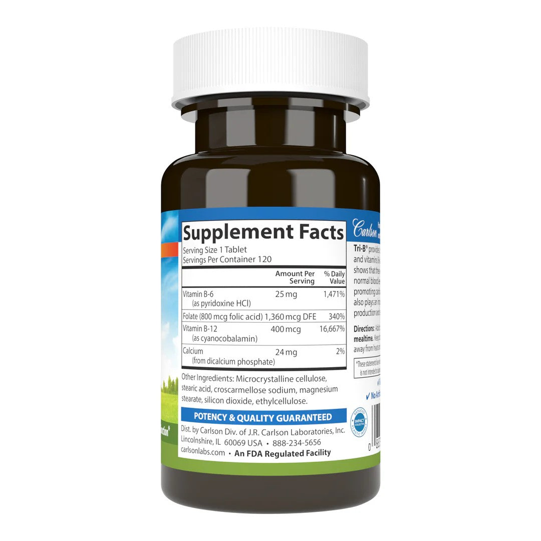 Tri-B® is a small tablet that provides the three B vitamins: folic acid and vitamins B-6 and B-12. Research indicates that these vitamins help maintain normal blood levels of homocysteine, which plays an important role in maintaining healthy arteries to promote heart health. Homocysteine is an amino acid produced by the body that's an important building block of protein. Support healthy blood and a healthy heart with Carlson Tri-B®.