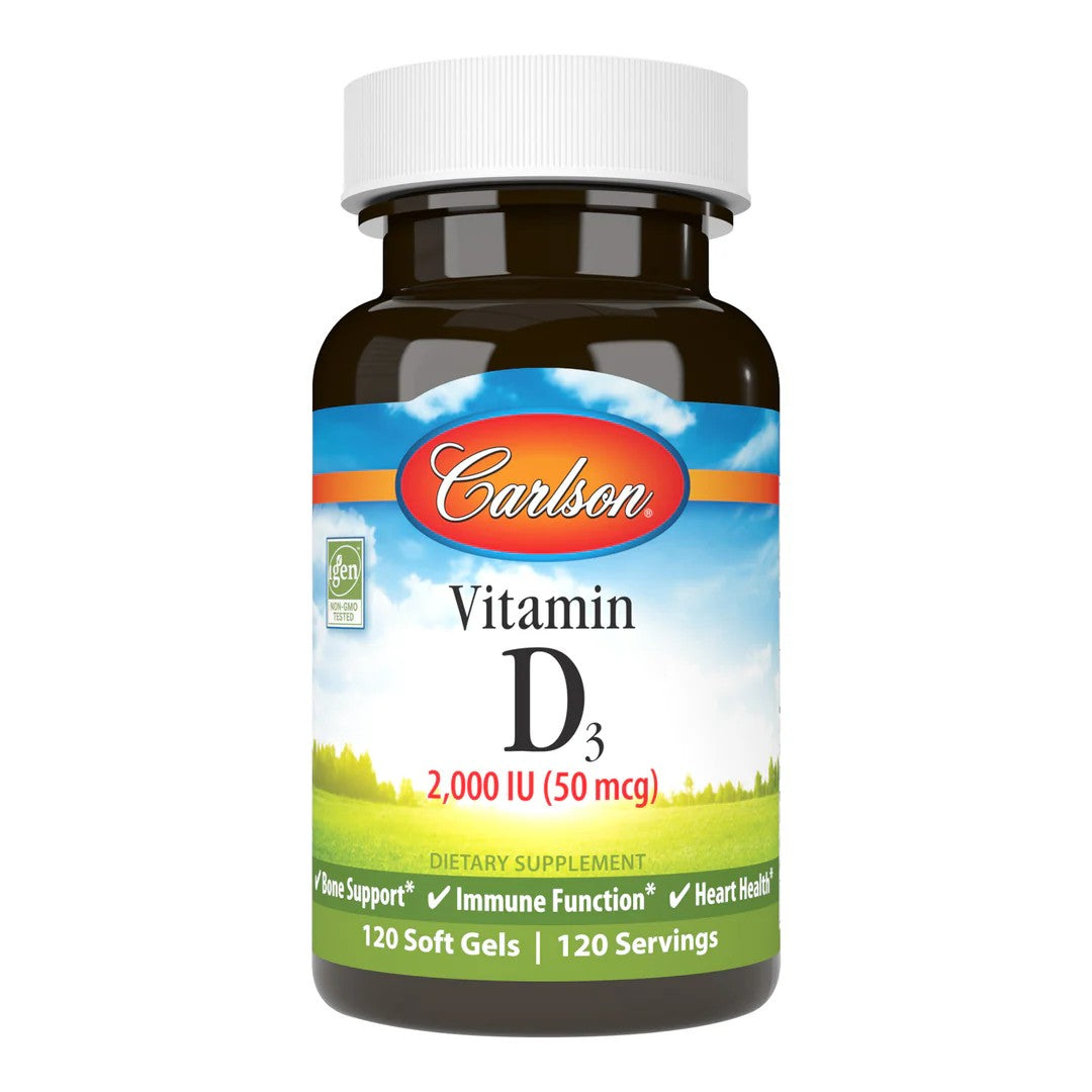 Carlson Vitamin D3 2,000 IU (50 mcg) is the preferred form of vitamin D that is important for promoting strong bones and supporting immune system and heart health. Higher levels of vitamin D3 in the blood are associated with strong bones and good health, as well as a strong immune system. Each soft gel provides 2,000 IU (50 mcg) of vitamin D3.
