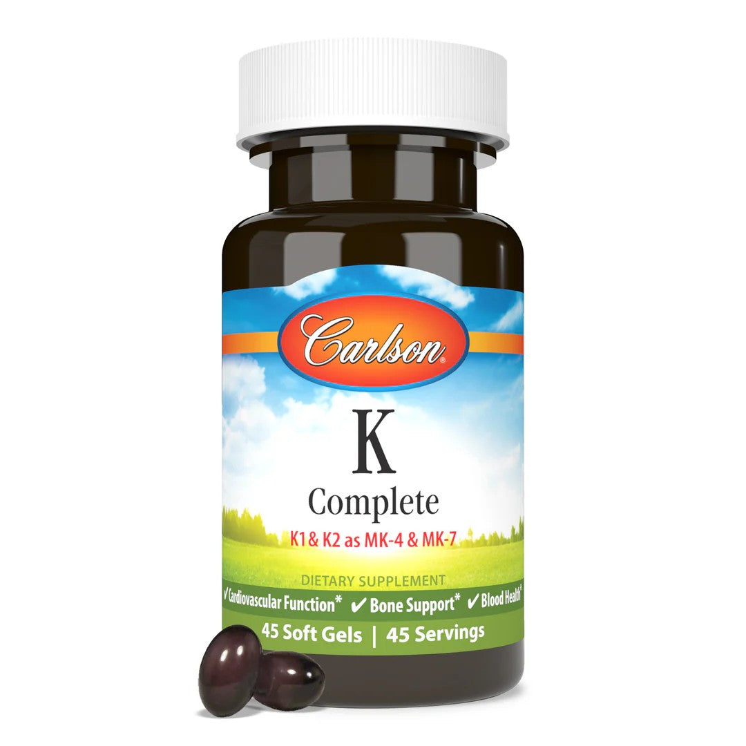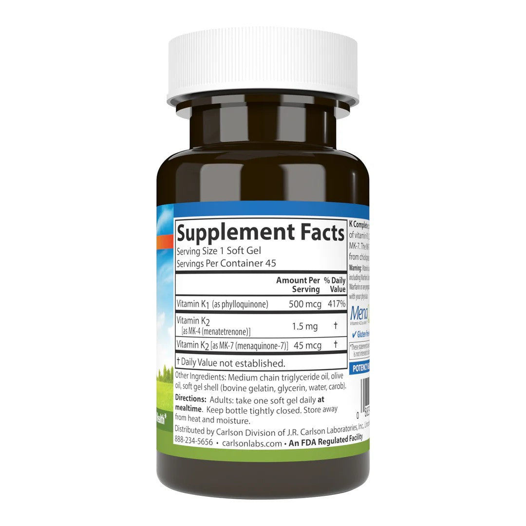 Unfortunately, it is difficult to get enough vitamin K through diet alone, which is why a supplement can be a great option. Each soft gel of K Complete provides 500 mcg of vitamin K1, 1.5 mg of vitamin K2 as MK-4, and 45 mcg of vitamin K2 as MK-7 for a powerful kick of K. Add vitamin K, the often overlooked but vital nutrient, to your diet with Carlson K Complete.